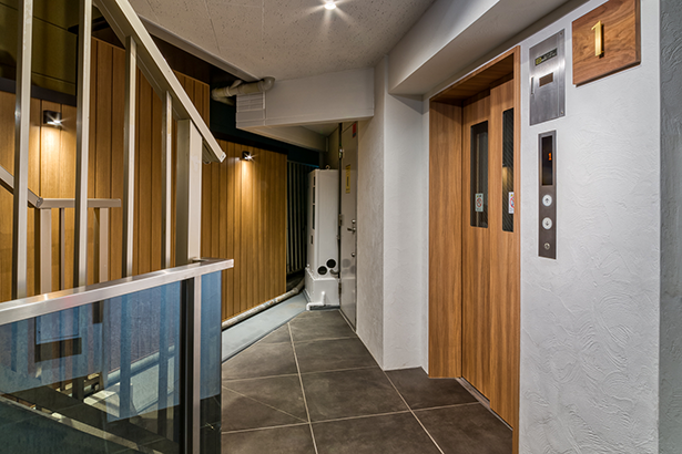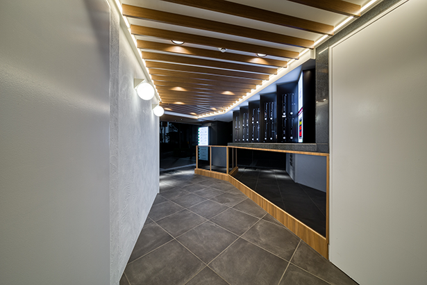 「閉鎖的でいびつなエントランスを改善したい」というご要望をいただき、エントランス奥のエレベーターまでの動線を明確にし、明るい木調の空間に仕上げることで、訪れるお客さまやテナントさまにとって魅力的な場所になるようご提案しました。