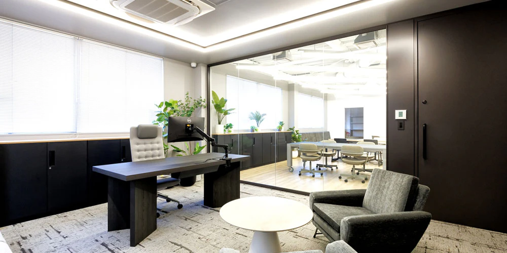 間仕切りをガラスパーテーションにすることで、空間の開放感を損なわずに仕切っています。
