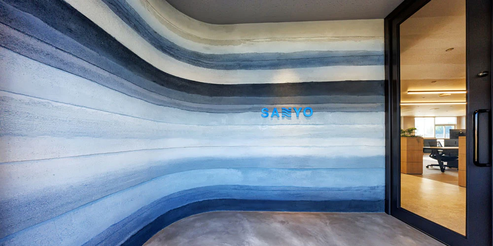 会社の顔となるエントランス。壁面は企業イメージカラーであるブルー系の左官材で仕上げています。