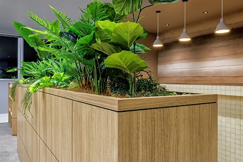 木目調のカウンターとプランターボックスにより、落ち着いた温もりのある空間を演出。