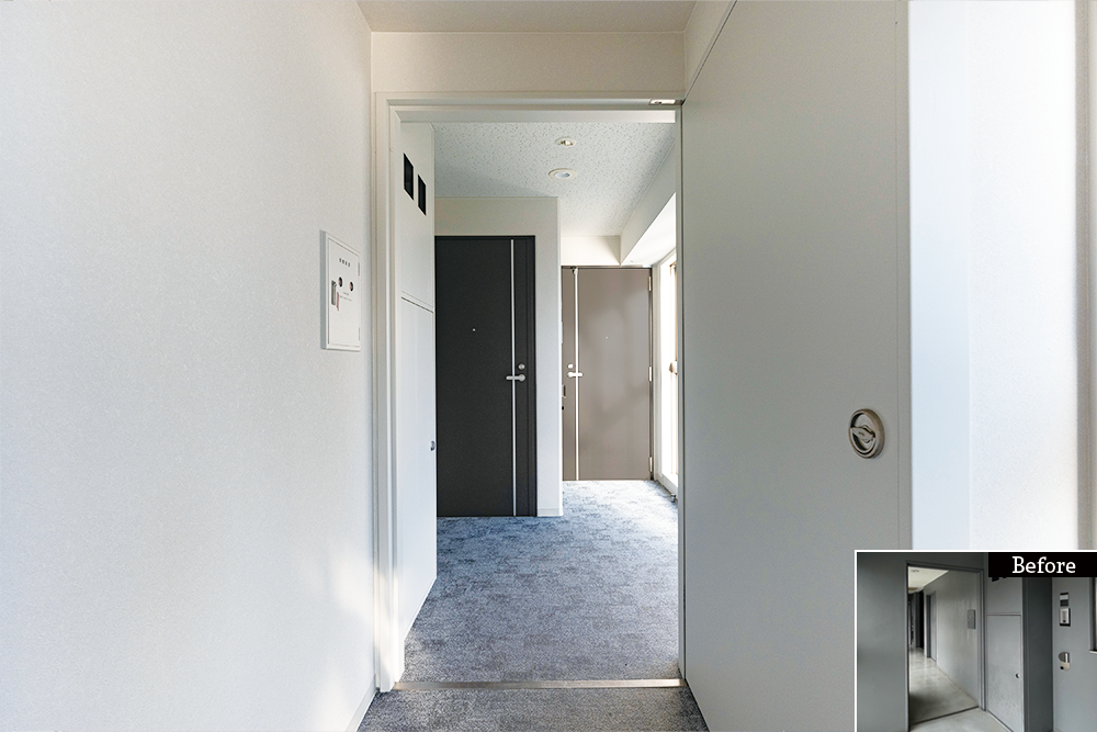 暗くてやや冷たい印象のあった既存の共用廊下は、エントランス空間と色合いを連動させて統一感を持たせつつ、