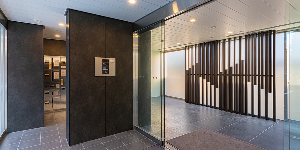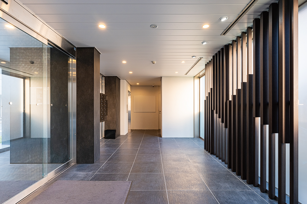 ホテルライクで高級感のあるデザインにしたいとご要望いただき、全体的にシックな色合いで統一しモダンでスタイリッシュな空間にすることで、バリューアップにつながるエントランスに仕上げました。