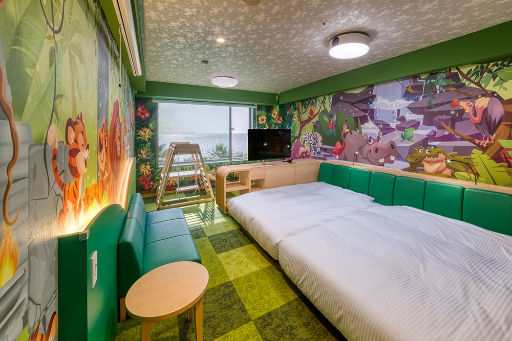 改修にあたり「各客室に分かりやすい3つのテーマが欲しい」とご要望いただき、コマーシャル内の「空と海のホテル三日月」というフレーズから「海」「空」「森」というテーマを設定。テラスから一望できる大自然の絶景からインスピレーションを受けたデザインにし、一目でキッズを虜にするような空間にしました。