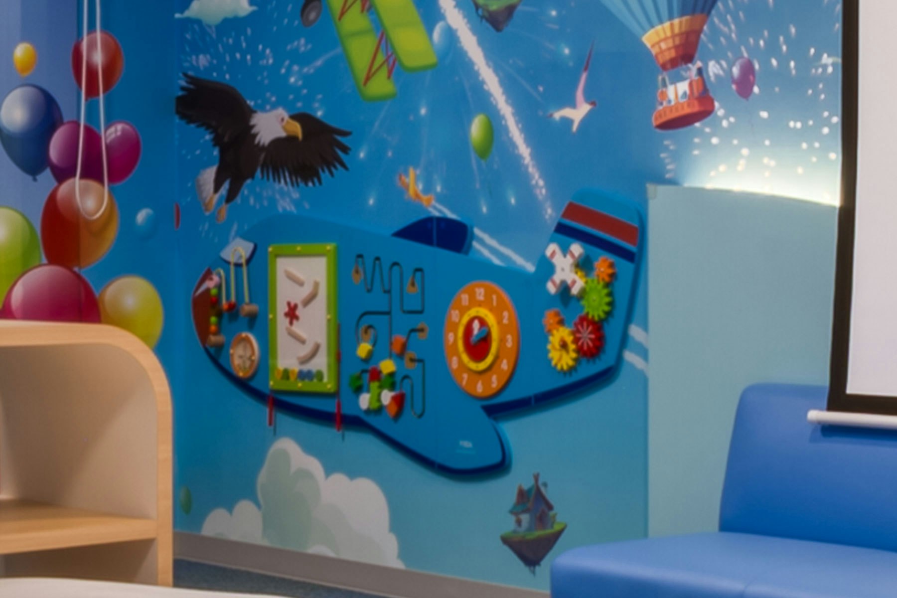 また「知育」のエッセンスとして、ハンギングチェアと飛行機型の知育玩具を設置。穏やかで明るい雰囲気の中で、想像力やひらめきを育むような空間に仕上げました。