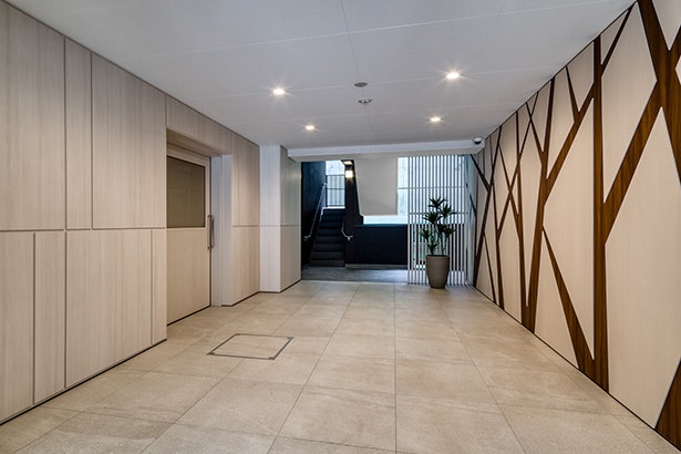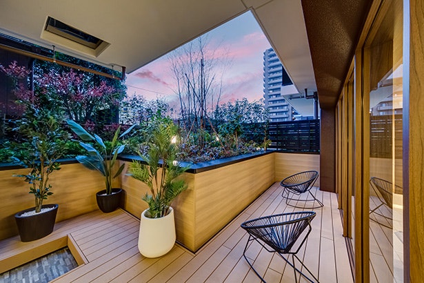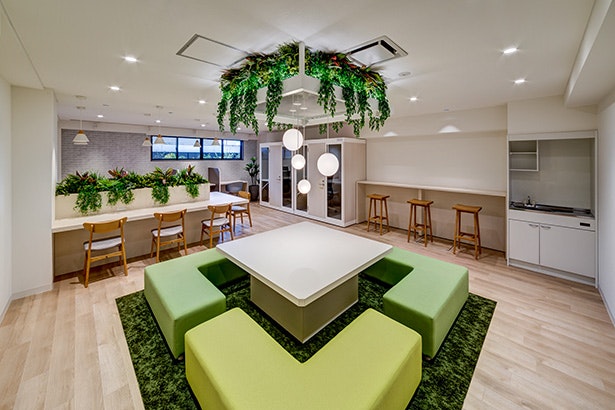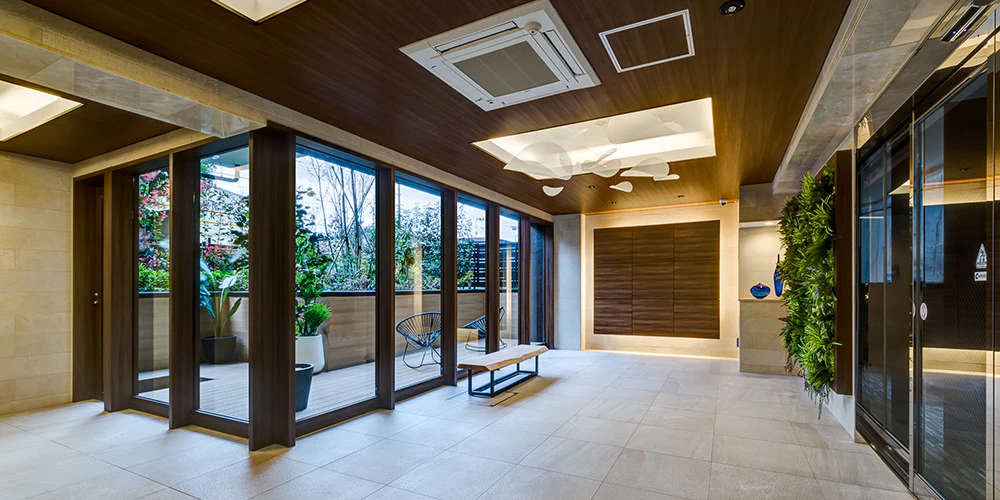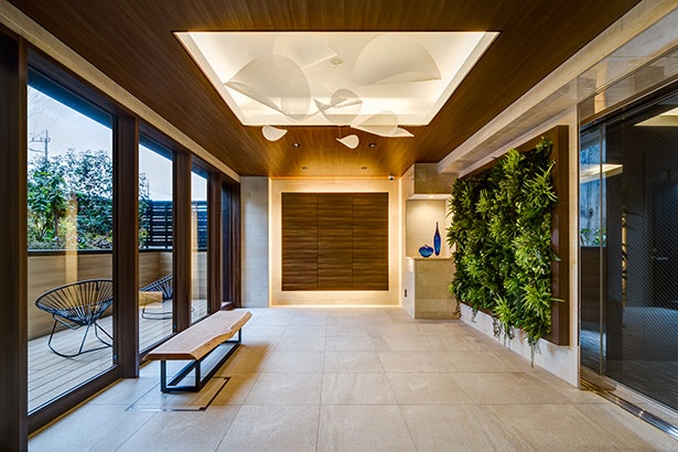 室内の壁面には大型のグリーンウォールを設置し、テラスと併せて自然を感じられるようにしました。既存のサッシに木目シート貼りすることで屋外と室内をシームレスに繋げ、自然の豊かさを感じる上質なエントランス空間に仕上げています。
