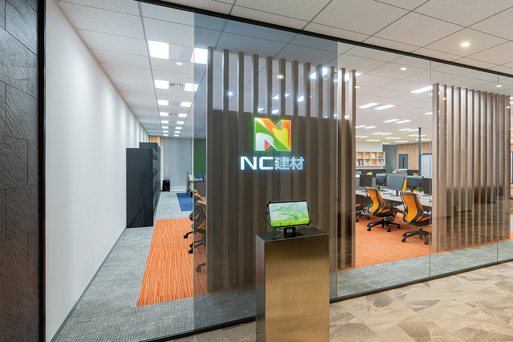 オープンスペースにはモニター付き造作棚を大きく構え、お客様・社員の方が企業のニュースリリースや商材情報などをチェックできるようにし、コミュニケーションを促すような設計にしました。