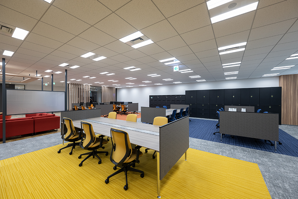 執務室はオフィス内に活気が生まれるような明るいカラーをゾーン毎に配置。チェアカラーも合わせることで統一感のあるデザインとしました。ナチュラルな木目とカラフルでポップな配色をとり、明るく働きやすい空間にとなっています。